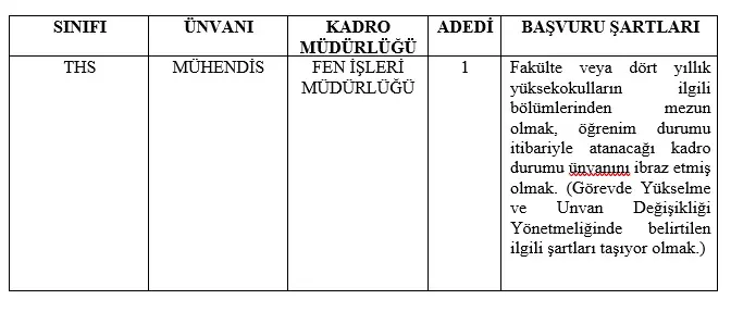 Çevre, Şehircilik ve İklim Değişikliği Bakanlığı Yerel Yönetimler Genel Müdürlüğünün 25.12.2025 tarihli 14376416 sayılı genelgesi ile Belediye ve Bağlı Kuruluşları ile Mahalli İdare Birlikleri Personelinin Görevde Yükselme ve Unvan Değişikliği Esaslarına Dair Yönetmelik uyarınca; Belediyemizde 657 sayılı Devlet Memurları Kanununa tabi olarak görev yapan personele yönelik 2026 yılında yapılacak olan Unvan Değişikliği Sınavına aşağıda yer alan boş kadrolar için gereken şartları taşıyanlardan katılmak isteyenlerin, Ek’de bulunan dilekçe ile 30.01.2026 Cuma günü saat 17:00’a kadar Yazı İşleri Müdürlüğüne başvuru dilekçelerini vermeleri gerekmektedir.
